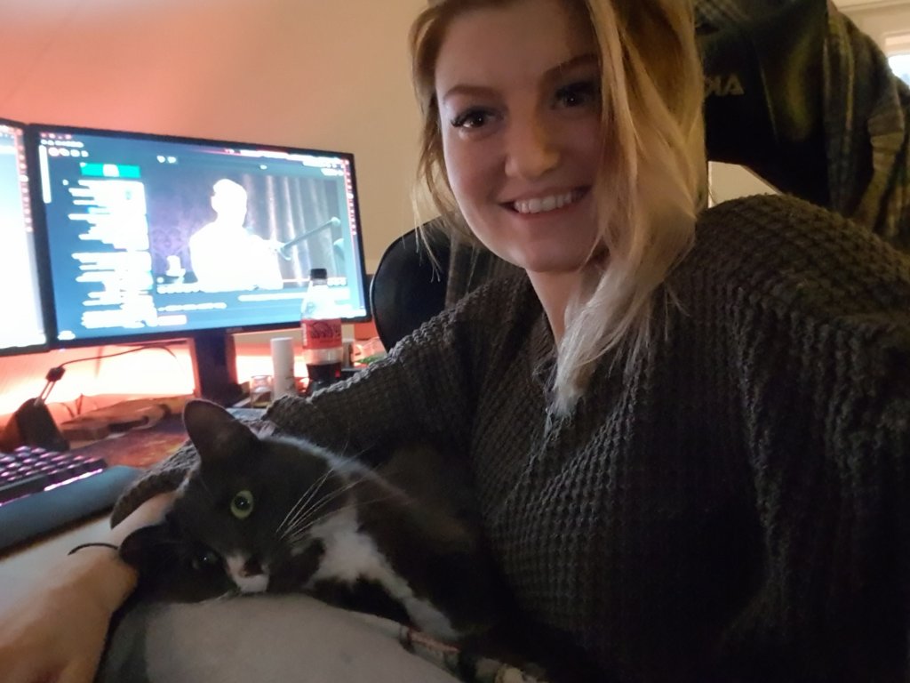 Here I am writing with Kajsa in my lap. Look at her face, haha!