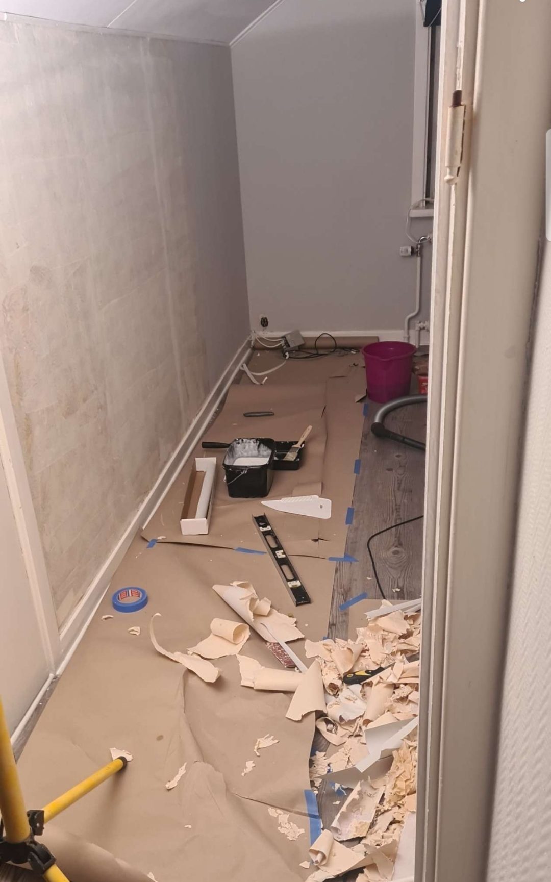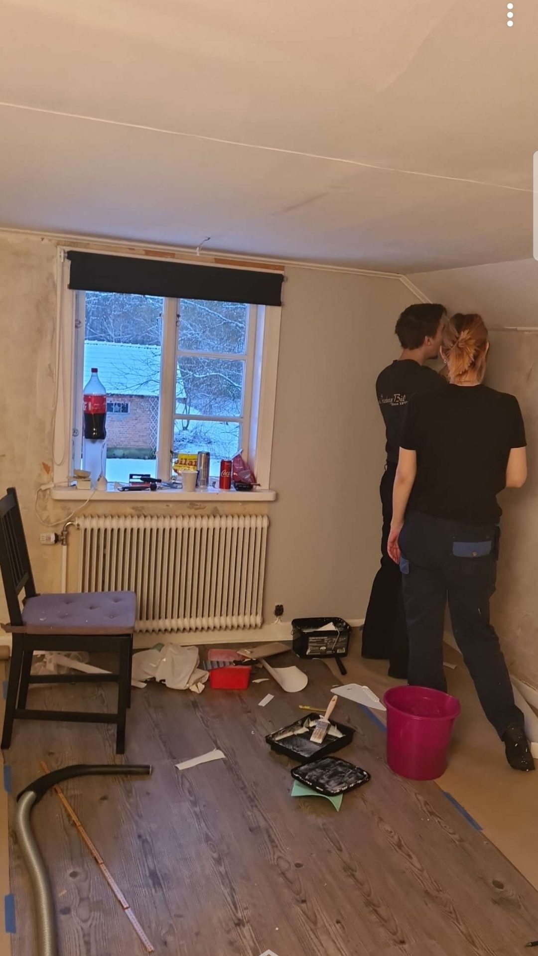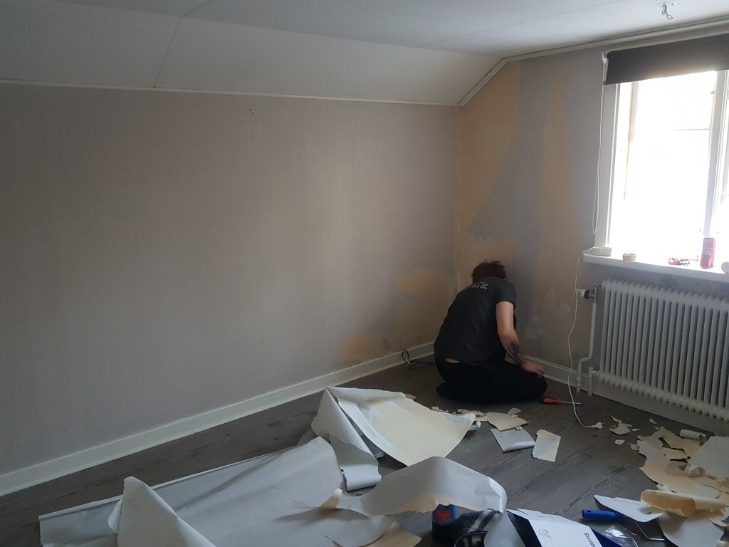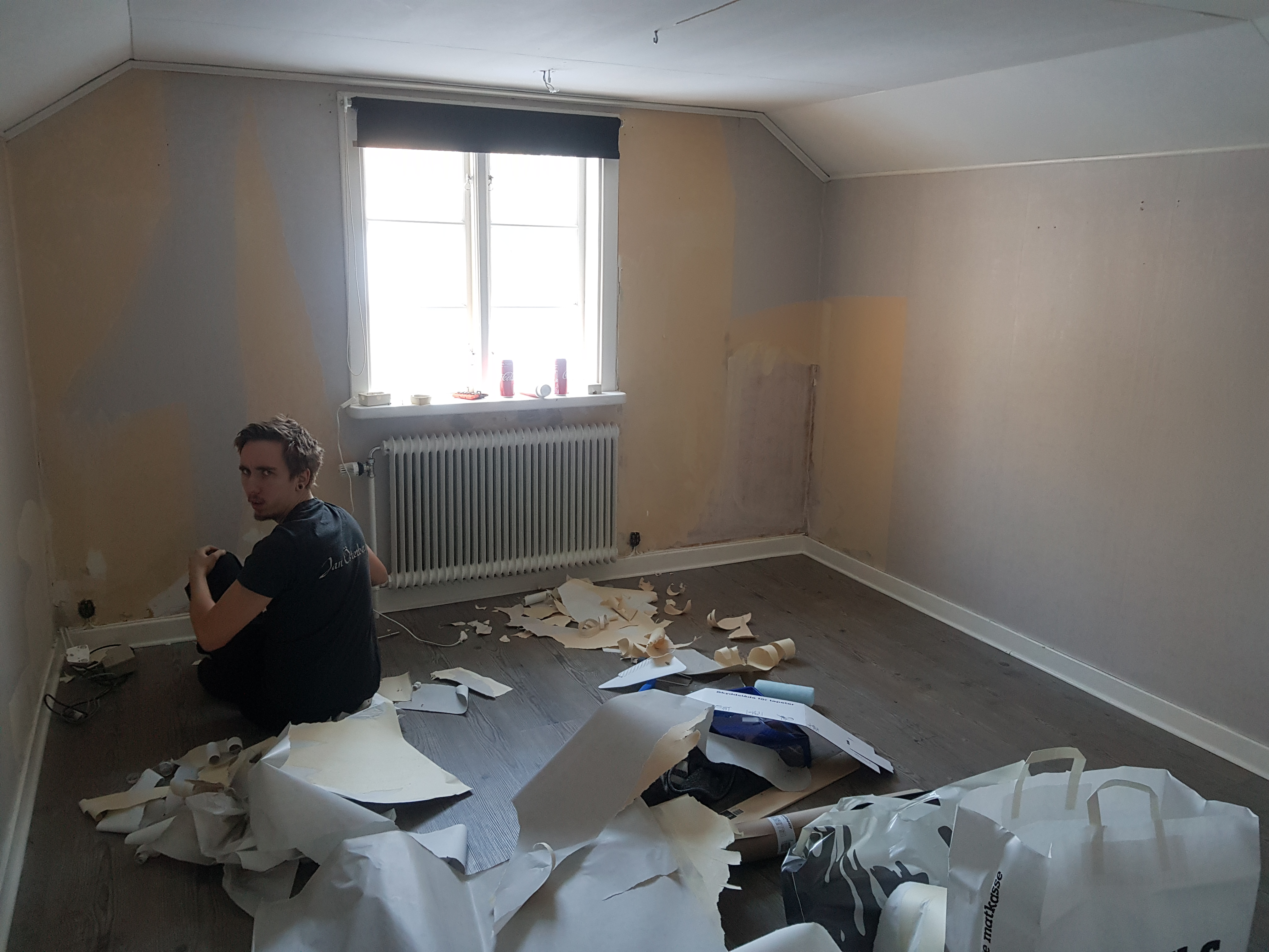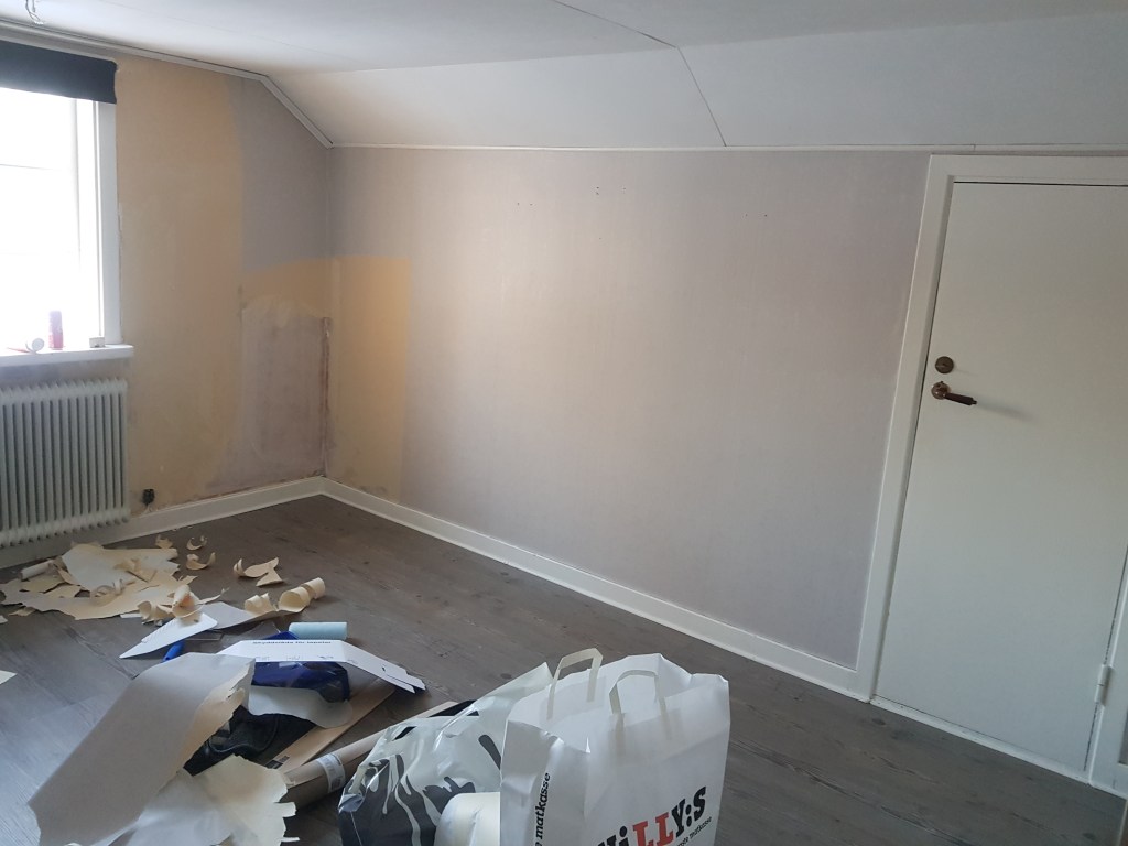 I live in Sweden with my boyfriend Kevin and our two cats (Figaro and Kajsa) in a cute little house in the countryside. We have now lived in this house for almost 1 year now. At this time last year we lived in a appartment in the city 10 minutes from here and every morning Kevin drove me out to the house before he went to work so I could work and prepare for us to move in 1 month later. I have never wallpapered before or anything so this was all a new experience for me but I have always thought it looked fun to do, and it was!! But boy at first we stumbled upon alot of problems…like the wallpaper didn’t want to stick to the wall at first so we got to scratch of all of the previous wallpapers, then go in with putty (I’m not really sure if that’s what you call it, in Sweden we call it ”spackel”) to even things out when almost all of the wallpapers where gone. Then all the fun could begun!