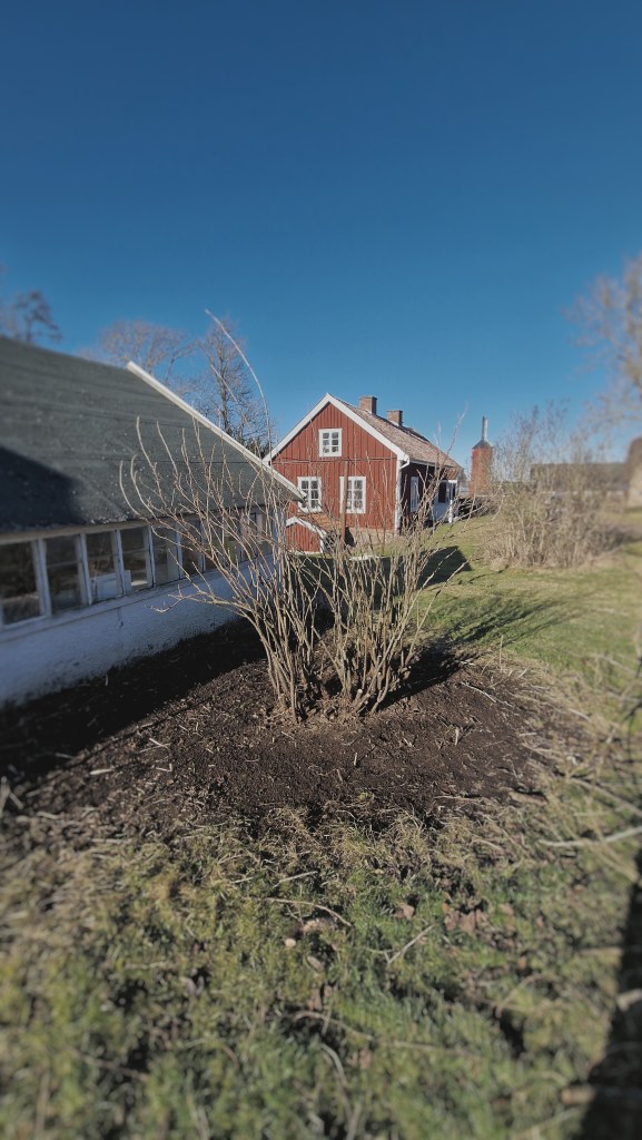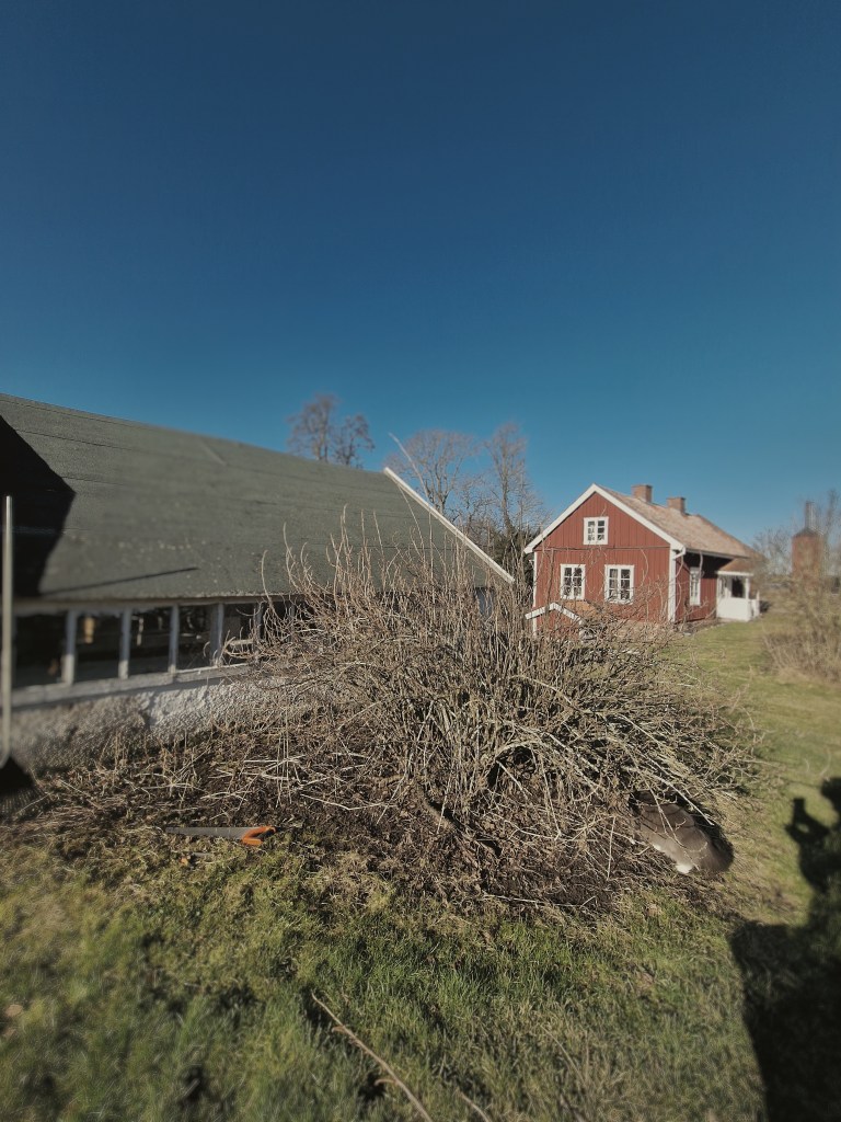 Vinbärsbuskarna som fanns uppstaplade i långa längor rensades på allt dött och skadat dom också. Det såg ut som att dom inte fått så mycket kärlek då ogräset hade vuxit sig högt och gjorde i princip buskarna oåtkomliga. Jag försökte kratta bort så mycket dött gräs som möjligt för att vi sedan skulle kunna köra med gräsklipparen mellan buskarna. Fruktträden fick sig en ganska hård beskärning då dom befann sig i samma skick som vinbärsbuskarna. Älgar och annat hade varit på och smaskat på många av grenarna och vissa träd var bara så tätbevuxna att dom legat och skavt mot varandra så att skador har uppstått och som sedan gjort att många av grenarna drabbats av fruktträdskräfta. Stenfruktsträden som plommon, körsbär och kvitten fick vänta till att JAS-perioden (juli,augusti,september) innan jag gav mig på att beskära dom också. Den stora grenhögen som blev av alla buskar och träd blev ganska fort ett minne blott då jag har en liten flismaskin hemma och där tanken slog mig att jag kanske kunde ta och använda dom till att göra min egna täckbark som jag vill ha runt pallkragarna i min tilltänkta blomsterhörna. Jag fick tag i armeringsjärn som var tänkt till spaljéerna. Tyvärr kom jag inte såpass mycket längre än att björnbären fick sig en liten halvdan spaljé att klättra på. Men det är bättre än ingenting tänker jag…🫢