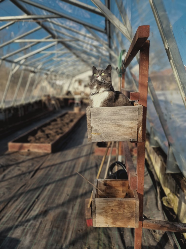 Kajsa var också med oss i växthuset men kanske inte riktigt lika involverad i själva planteringen. Istället letade hon upp bästa lådan i hela växthuset som hon sedan utsåg till sitt personliga V.I.P-bås.